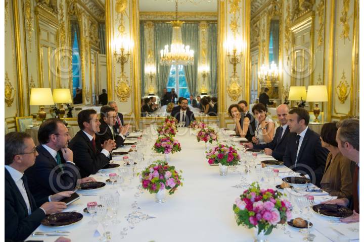 PARÍS, FRANCIA, 06JULIO2017.- El Presidente Enrique Peña Nieto y el Mandatario francés, Emmanuel Macron, encabezaron una cena de trabajo realizada en el Palacio del Eliseo, en la que los Mandatarios y sus comitivas dialogaron sobre diversos aspectos de la relación bilateral. FOTO: PRESIDENCIA /CUARTOSCURO.COM
