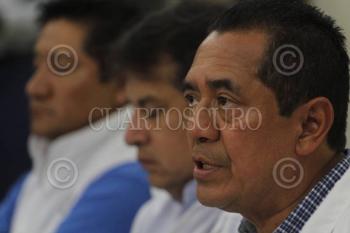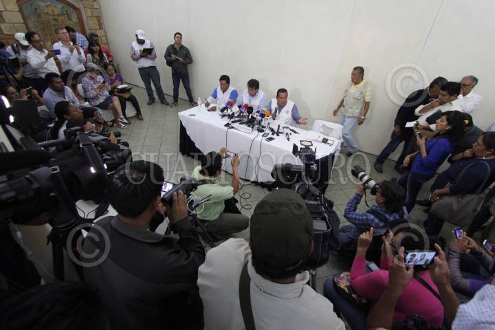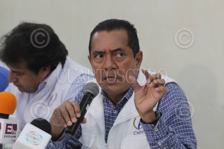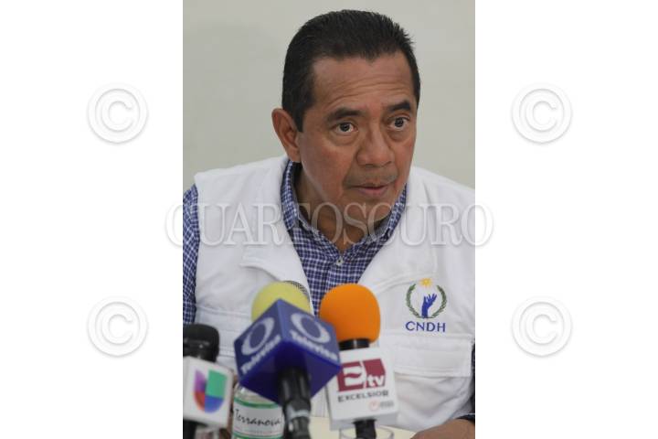 OAXACA, OAXACA., 06JULIO2016.- El segundo visitador general de la Comisión Nacional de Derechos Humanos (CNDH), Enrique Guadarrama López ofreció una conferencia de prensa en la ciudad de Oaxaca donde señaló que las investigaciones de los hechos ocurridos el pasado 19 de junio en Asunción Nochixtlán continúan su curso, además señaló que la Fiscalía General del Estado aún no ha entregado los informes solicitados por la comisión como son las necropsias efectuadas a los cuerpos de los 8 fallecidos en Nochixtlán, además indicó que de los 6 desaparecidos 4 ya fueron localizados, sin embargo de dos más aún se desconoce su paradero. FOTO: ARTURO PÉREZ ALFONSO /CUARTOSCURO.COM