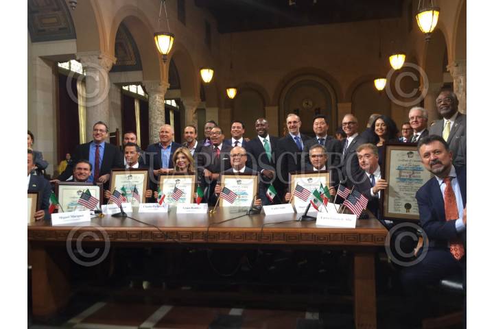 LOS ÁNGELES, CALIFORNIA, 07ABRIL2017.- Miembros de la CONAGO, encabezados por Graco Ramírez, gobernador de Morelos, Francisco Vega, gobernador de Baja California, Miguel Ángel Mancera Espinosa, jefe de gobierno de la Ciudad de México, y Cuauhtémoc Cárdenas, entre otros servidores público mexicanos, realizaron una visita al alcalde Eric Michael Garcetti, alcalde de Los Ángeles, California, Estados Unidos, con el propósito de entablar un diálogo en pro de los migrantes. Durante el evento, el alcalde de la ciudad estadounidense entregó a los gobernadores mexicanos el certificado de ciudadanía honoraria. FOTO: CUARTOSCURO.COM