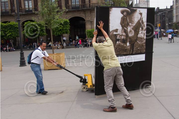 CIUDAD DE MÉXICO, 28ABRIL2019.- Trabajadores de la ciudad, remueven mamparas de la exposición alusiva a Emiliano Zapata, en la plancha del Zócalo Capitalino. FOTO: ROGELIO MORALES /CUARTOSCURO.COM