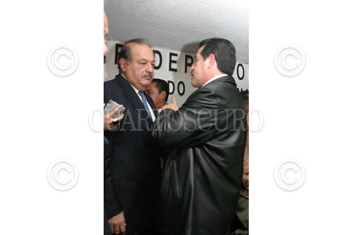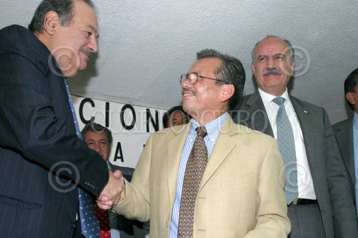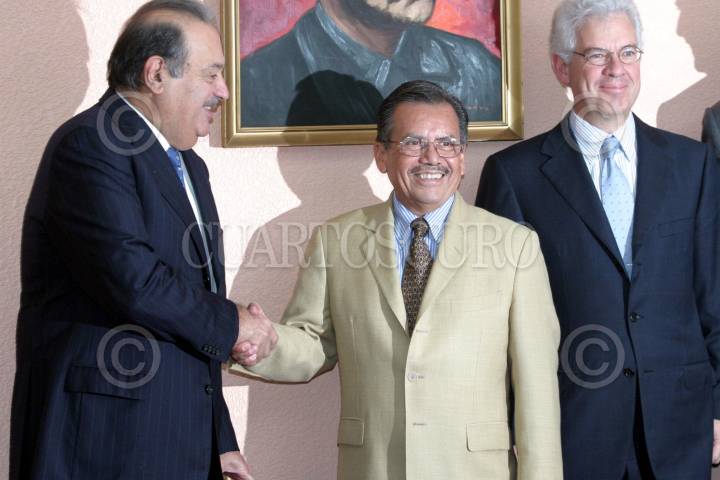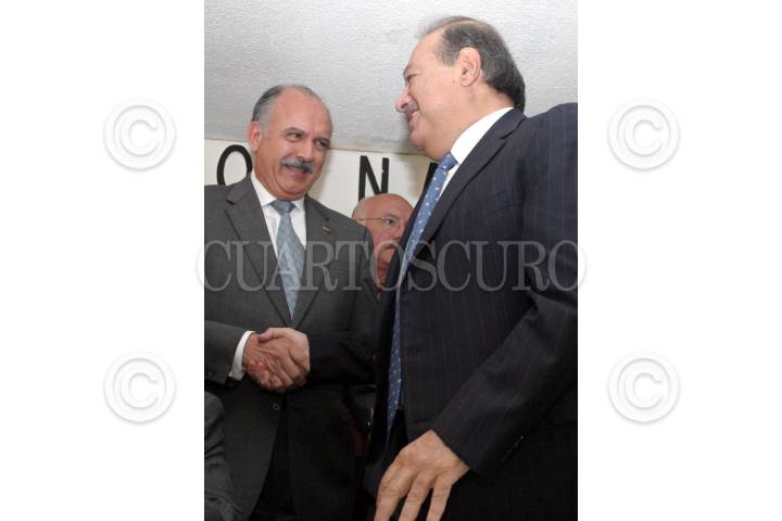 MEXICO, D.F, 13OCTUBRE005.- Carlos Slim Helú, presidente vitalico del grupo CARSO y Diodoro Carrasco, durante el encuentro para ratificar el Acuerdo Nacional para la Unidad, el Estado de Derechos, el Desarrollo, la Inversión y el Empleo, en un encuentro sostenido en las instalaciones de la CNC. FOTO: Moisés Pablo/CUARTOSCURO.COM
