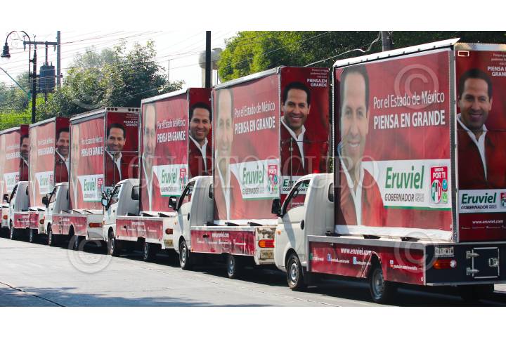 TOLUCA, ESTADO DE MÉXICO, 10JUNIO2011.- Camiones de publicidad recorren calles voceando los eventos donde asistirá el candidato de la coalición "Unidos Por Tí" Eruviel Avila Villegas. FOTO: SAÚL LÓPEZ/CUARTOSCURO.COM