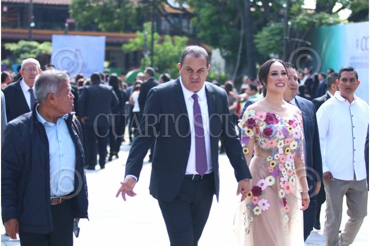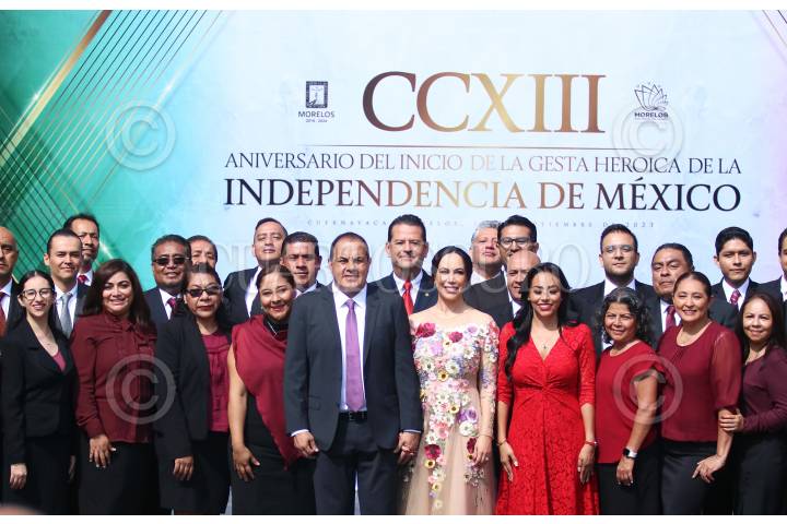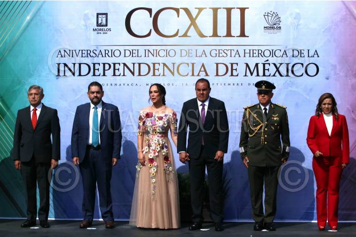 CUERNAVACA, MORELOS, 16SEPTIEMBRE2023.- El gobernador de Morelos, Cuauhtémoc Blanco Bravo y su esposa Natalia Resende Moreira, durante el evento oficial por la conmemoración del 213 aniversario del inicio de la gesta de la Independencia. Lo acompañan el presidente municipal de Cuernavaca, José Luis Urióstegui, el presidente del Tribunal Superior de Justicia, Jorge Gamboa y el comandante de la 24 Zona Militar Antonio Ramírez Escobedo. FOTO: MARGARITO PÉREZ RETANA / CUARTOSCURO.COM