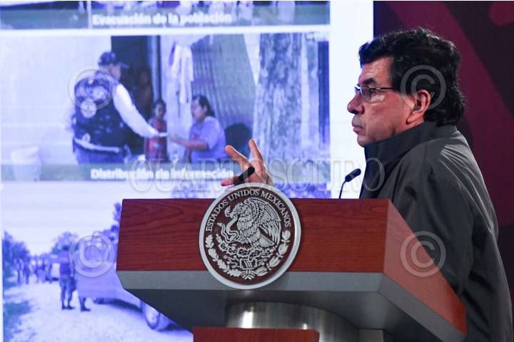 CIUDAD DE MÉXICO, 05JULIO2024.- Jesús Ramírez Cuevas, coordinador General de Comunicación Social de la Presidencia de la República, encabezó conferencia de prensa en Palacio Nacional para informar el saldo blanco y acciones en Quintana Roo tras el paso de la tormenta tropical "Beryl", compartida vía telemática con Laura Velázquez, coordinadora Nacional de Protección Civil, y Mara Lezama, gobernadora de Quintana Roo. FOTO: MARIO JASSO/CUARTOSCURO.COM