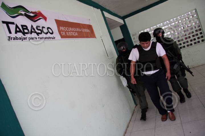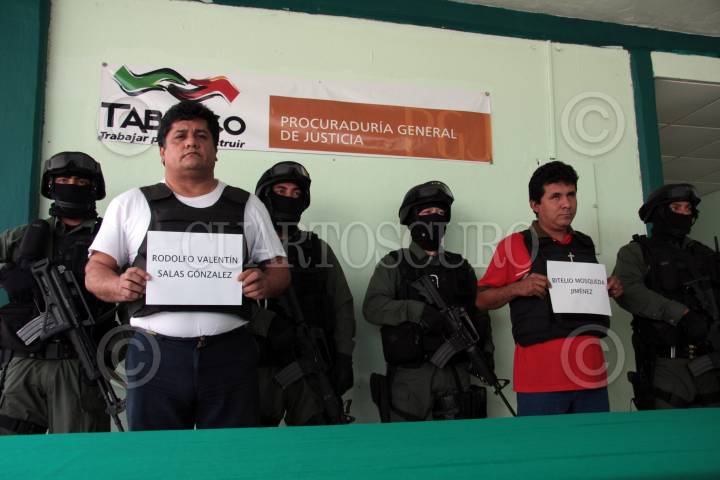 VILLAHERMOSA, TABASCO, 04FEBRERO2009.- Según las pesquisas realizadas por Subprocuraduría de Investigación Especializada en Delincuencia Organizada (SIEDO), conjuntamente con la Policía Ministerial y Fiscalia de Chiapas; el ex director y ex agente de segunda de la dirección municipal de Transito, Rodolfo Valentín Salas González y Bitelio Mosqueda Jiménez participaron en el plagio del hoy occiso Cenobio Argauiz Zurita. Ambos confeso revelaron que su participación fue el recibir 10 mil pesos de la delincuencia organizada para entregar a la victima. FOTO. MARCO POLO GUZMÁN HERNÁNDEZ/CUARTOSCURO.COM