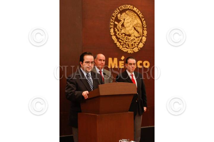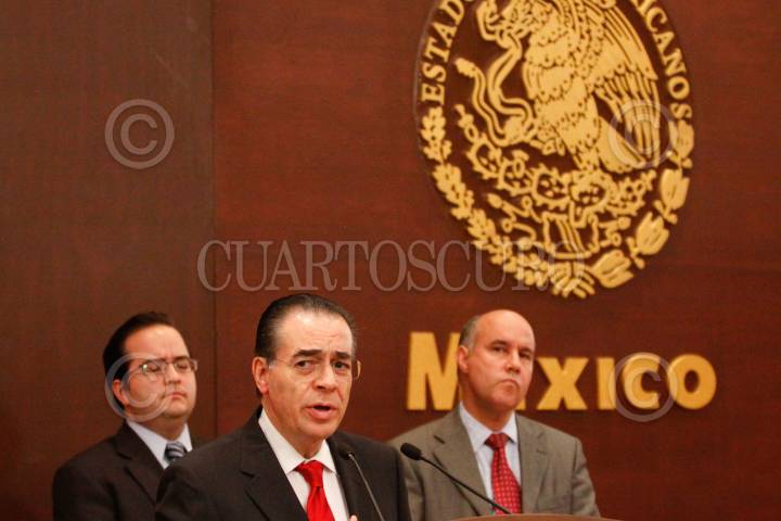 MÉXICO, D.F., 06SEPTIEMBRE2010.- Ricardo Najera, vocero de la PGR, Alejandro Poiré, vocero de seguridad nacional y Salvador Beltrán de Rió, subsecretario para América Latina y El Caribe de la cancillería en conferencia de prensa, dieron a conocer los autores de la matanza de 72 inmigrantes en el municipio de San Fernando, Tamaulipas. FOTO: SAÚL LÓPEZ/CUARTOSCURO.COM