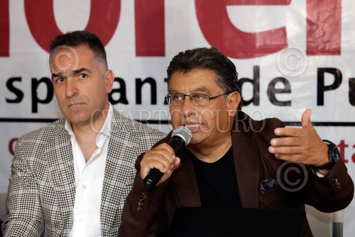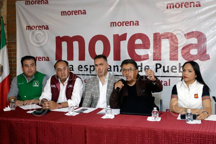 PUEBLA, PUEBLA, 12ABRIL2019.- Los voceros Carlos Meza y David Méndez, acompañados de las dirigencias estatales de los partidos PVEM, Morena y PT, señalaron durante rueda de prensa que la el Tribunal Electoral del Poder Judicial de la Federación, avala la candidatura de Miguel Barbosa y sólo ordena que Morena amplíe la información del método de selección del candidato FOTO: MIREYA NOVO/CUARTOSCURO.COM