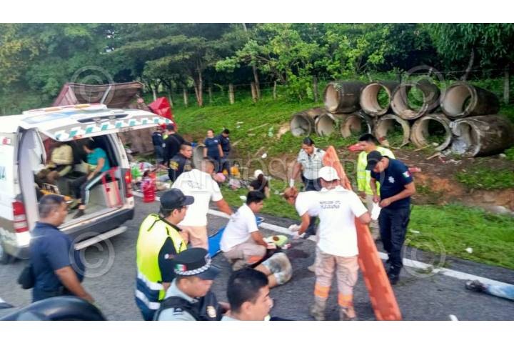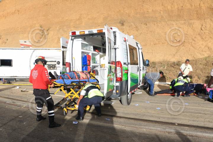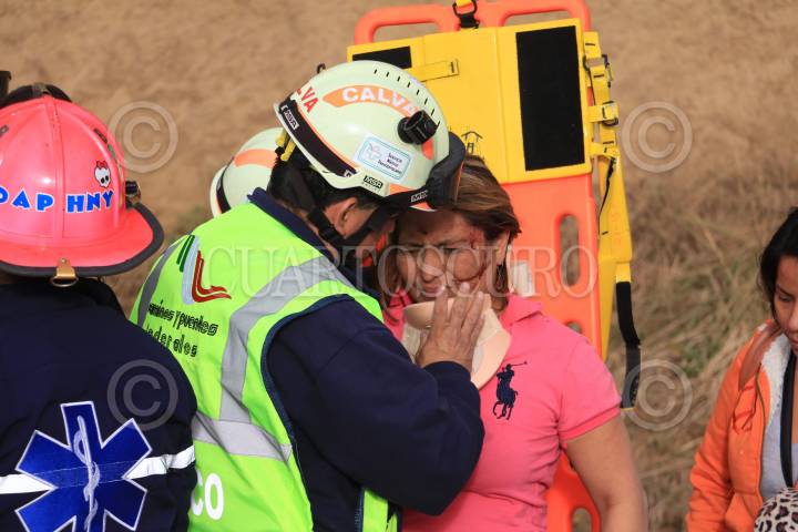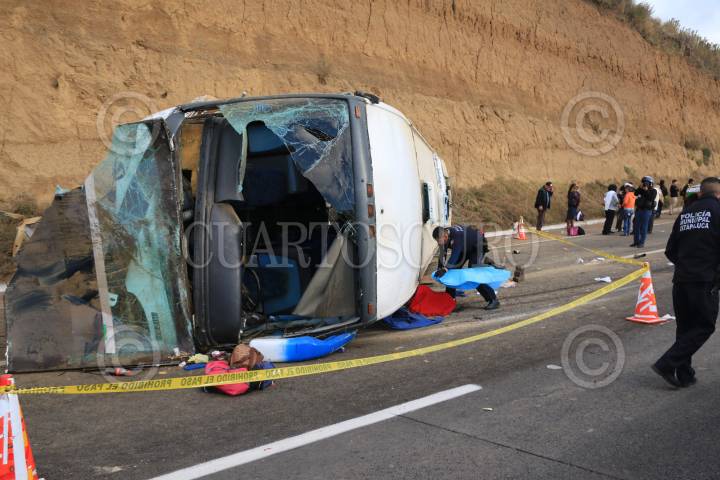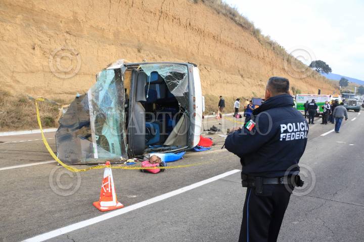 TLALNEPANTLA, ESTADO DE MÉXICO, 16ENERO2024.- Una combi del transporte público sufrió una volcadura luego de que el chófer supuestamente se infarta y muriera, por lo que perdió el control de su unidad, el incidente dejo un saldo de 17 heridos. Los hechos en la carretera México-Pachuca, a la altura de la colonia el Vigilante. FOTO: ROGELIO MORALES/CUARTOSCURO.COM