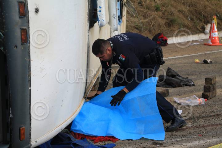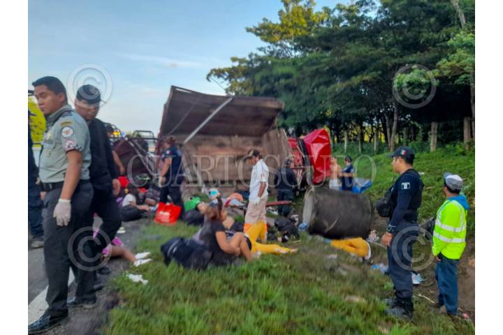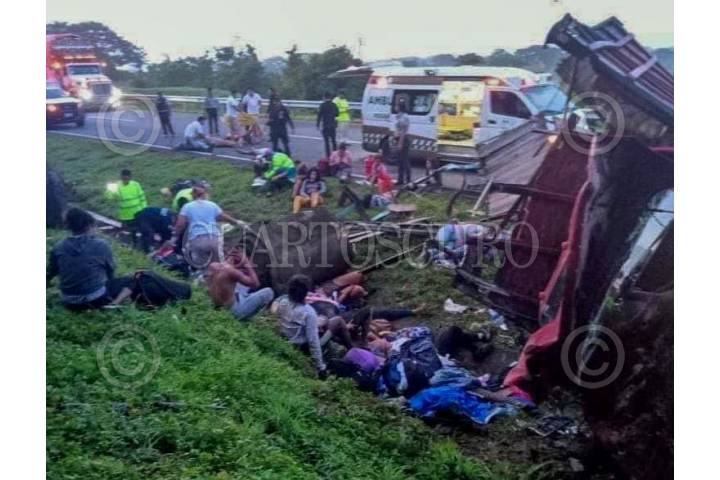 PIJIJIAPAN, CHIAPAS, 01OCTUBRE2023.- Diez migrantes muertos fue el saldo de un accidente vehicular. Al 911 reportaron un accidente vehicular en el carretera costera Pijijiapan - Tonala. En kilómetros 134 se observa un vehículo volcado y a su rededor se observan personas lesionadas y varios cuerpos. FOTO: CUARTOSCURO.COM