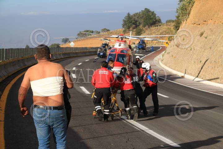 CIUDAD DE MÉXICO, 20DICIEMBRE2016.- Una persona muerta y 42 personas lesionadas lesionadas fue el saldo de una voladura de un autobús que circulaba sobre el kilómetro 42 de la autopista México-Puebla, servicio de emergencia de todas las corporaciones auxiliaron en el percance asi como cuatro helicópteros del escuadrón Cóndores y Relámpagos. FOTO: SAÚL LÓPEZ /CUARTOSCURO.COM