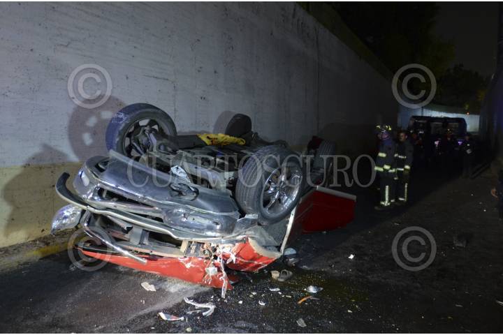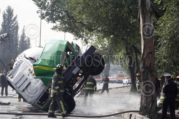 MÉXICO, D.F., 15AGOSTO2009.- Una camioneta de tres y media toneladas que transportaba quesos, termino volcada despues de que perdio el control al brincar el camellon que divide los sentidos de la avenida Parque Lira a la altura de Constituyentes en la colonia San Miguel Chapultepec perimetro de la delegación Miguel Hidalgo; misma que impacto a una revolvedora y a un auto de servicio publico. Del accidente solo reportaron dos personas con lesiones leves. FOTO: LUIS CARBAYO/CUARTOSCURO.COM