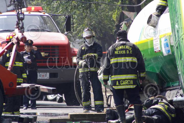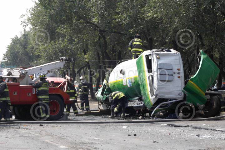 MÉXICO, D.F., 16JUNIO2011.- Una pipa que transportaba Gas L.P. volcó al perder el control tras impactarse con una unidad de servicio público en el cruce de calzada Ignacio Zaragoza a la altura de la calle Ixtaccihuatl en la colonia Moctezuma, de la Delegación Venustiano Carranza. En el lugar, laboraron por más de 2 horas elementos de Bomberos y personal de Protección Civil de esta Delegación. FOTO: LUIS CARBAYO/CUARTOSCURO.COM