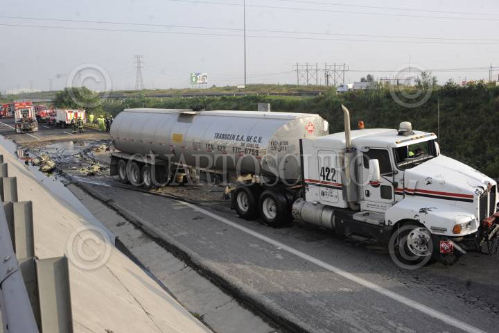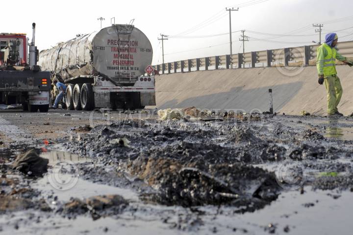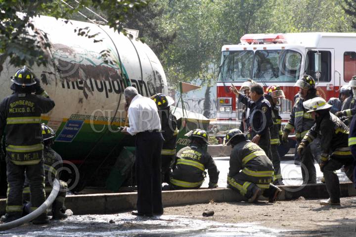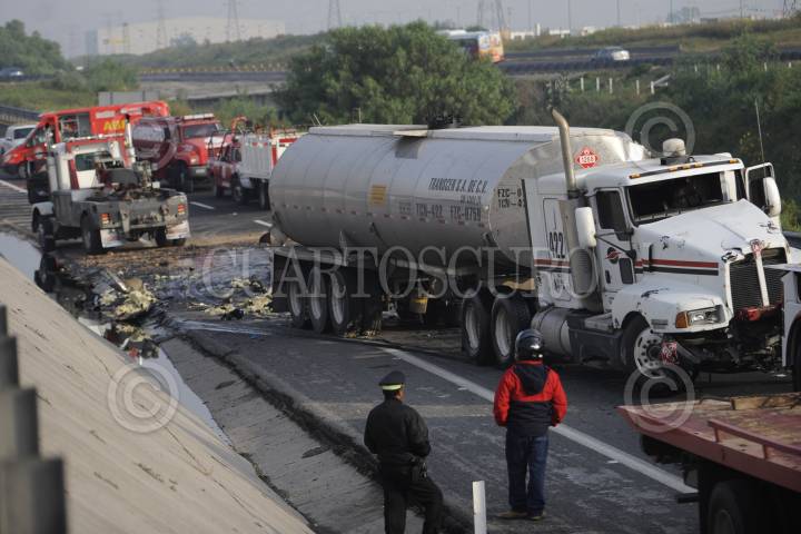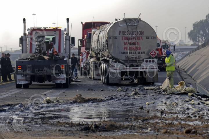 ECATEPEC, ESTADO DE MÉXICO, 08OCTUBRE2011.- Una pipa que transportaba chapopote volcó sobre el Circuito Exterior Mexiquense a la altura de la carretera Lechería Texcoco, perímetro del municipio de Ecatepec. Dicha arteria se mantuvo cerrada por varias horas mientras laboraba personal de Bomberos en la limpieza de la cinta asfáltica. FOTO: LUIS CARBAYO/CUARTOSCURO.COM