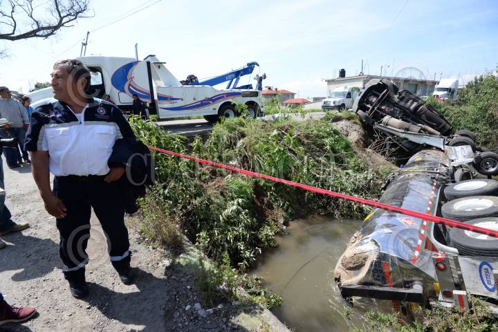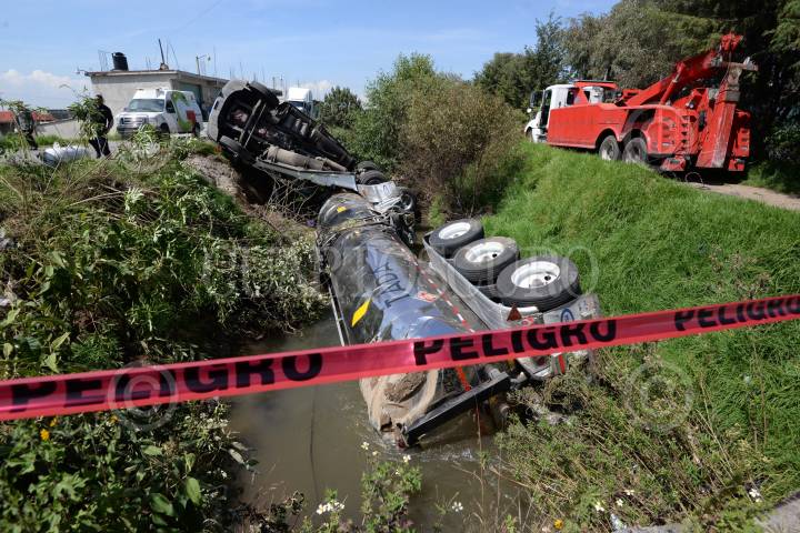 XONACATLAN, ESTADO DE MEXICO, 09OCTUBRE2017.- Una pipa que transportaba aceite para asfalto volcó en un río en la colonia Emiliano Zapata, no se registraron lesionados, el chofer perdió el control de la unidad y terminó en el fondo del río; Protección Civil municipal acordonó la zona para evitar un incidente mayor. FOTO: ARTEMIO GUERRA BAZ / CUARTOSCURO.COM