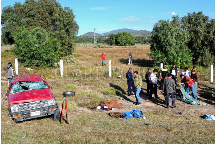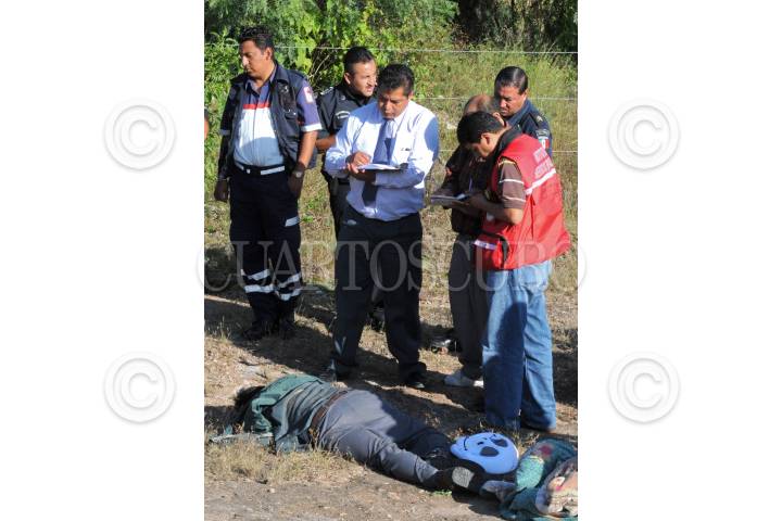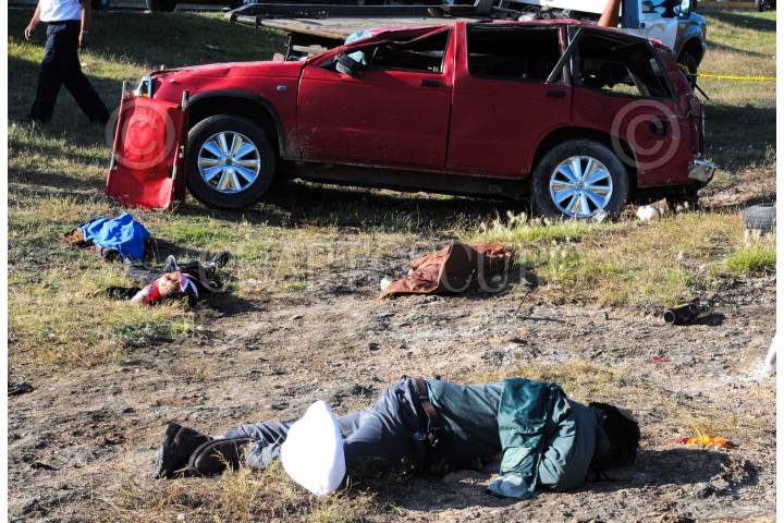 MÉXICO, D.F., 02NOVIEMBRE2009.- Un joven de 13 años y un adulto de 35 perdieron la vida al volcar la camioneta Chevrolet color roja donde viajaban con dirección a Pachuca. Al lugar arribaron elementos de la Procuraduria del Estado de Hidalgo para el levantamiento de los cuerpos y trasladarlos al forense en el Municipio de Tizayuca. FOTO: LUIS CARBAYO/CUARTOSCURO.COM