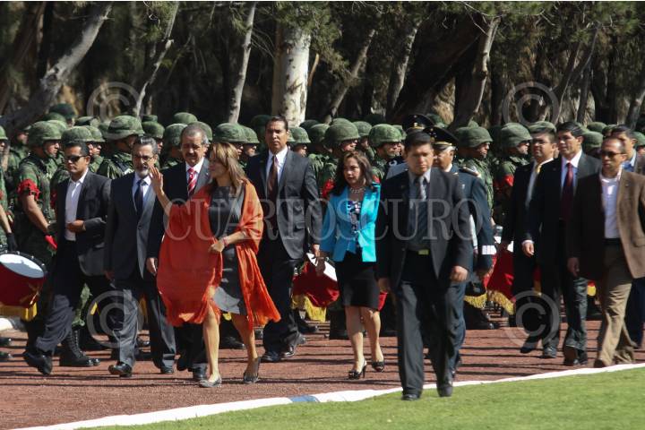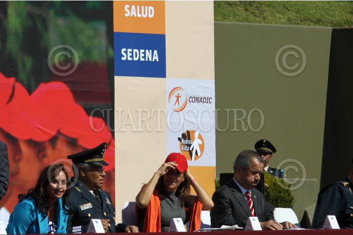 MÉXICO, D.F., 12MARZO2011.- Margarita Zavala, esposa del presidente Felipe Calderón acompañada de Guillermo Galván, secretario de la Defensa y José Ángel Cordoba Villalobos, secretario de Salud durante el evento del inicio de la Campaña de Capacitación a los Conscriptos y Voluntarias en la Campaña Nacional para la prevención de las adicciones que se realizo en el Campo Militar No. 1A. FOTO: RODOLFO ANGULO/CUARTOSCURO.COM