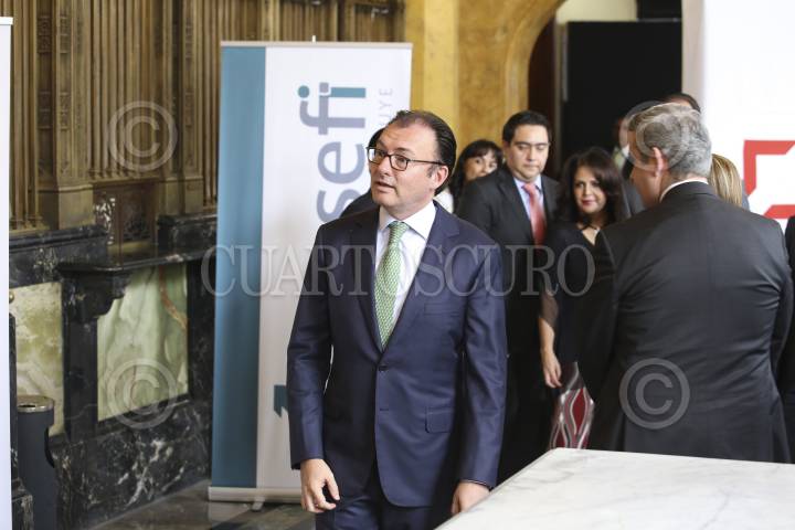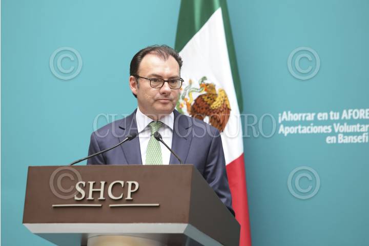 CIUDAD DE MÉXICO, 10AGOSTO2016.- Luis Videgaray, secretario de Hacienda y Crédito Público (SCHP), encabezó el evento "¡Ahorrar en tu AFORE nunca fue tan facil!", el cual busca incentivar las aportaciones voluntarias de los trabajadores a tráves de Bansefi y por celular vía Transfer, en instalaciones del Palacio Postal. FOTO: CUARTOSCURO.COM