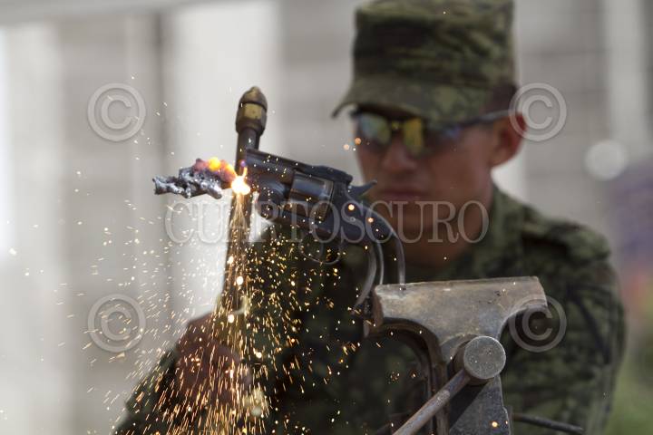 CUERNAVACA, MORELOS, 03JULIO2024.- Soldados de la 24 Zona Militar destruyen una pistola calibre .22, como parte de la "Feria de la Paz y Desarme Voluntario". El evento fue presidido por el gobernador, Cuauhtémoc Blanco Bravo, que estuvo acompañado del general Ernesto José Zapata Pérez, comandante de la primera región militar, José Luis Bucio Quiroz, comandante de la 24 Zona Militar y Gaudencio Ramos Jiménez, coordinador de la Guardia Nacional en la entidad. FOTO: MARGARITO PÉREZ RETANA/CUARTOSCURO.COM