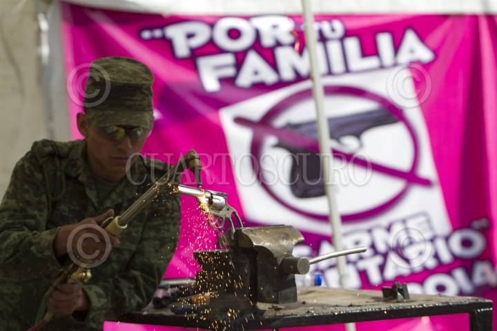 CIUDAD DE MÉXICO, 30JULIO2018.- En la Plaza de las Américas de la Basílica de Guadalupe se realizó una jornada más del programa "Por tu familia, desarme voluntario", a la cual acudieron decenas de niños acompañados de sus padres a intercambiar sus juguetes bélicos por juguetes didácticos. También varios ciudadanos intercambiaron sus armas de fuego y municiones por dinero en efectivo, las piezas recolectadas fueron destruidas por elementos del Ejercito. FOTO: MOISÉS PABLO /CUARTOSCURO.COM