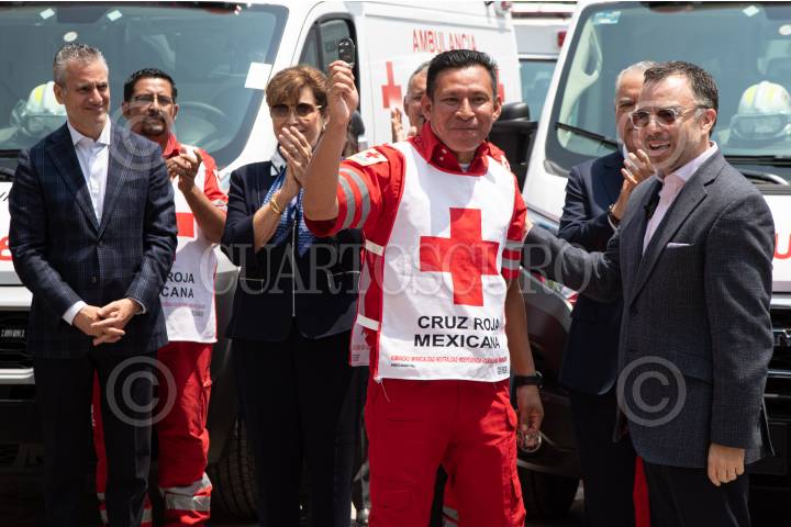 Antonio Domínguez, Director General de Fundación Azteca entrega una llave a uno de los voluntarios durante la ceremonia de entrega de nuevas ambulancias para la Cruz Roja Mexicana, esto como parte de la renovación del parque vehicular.