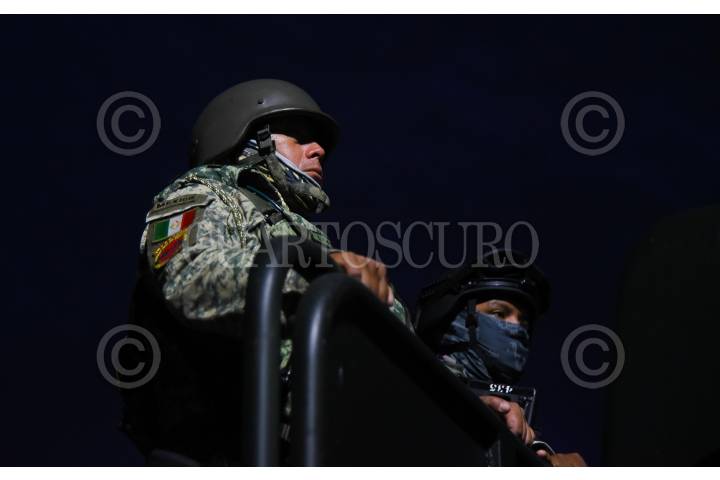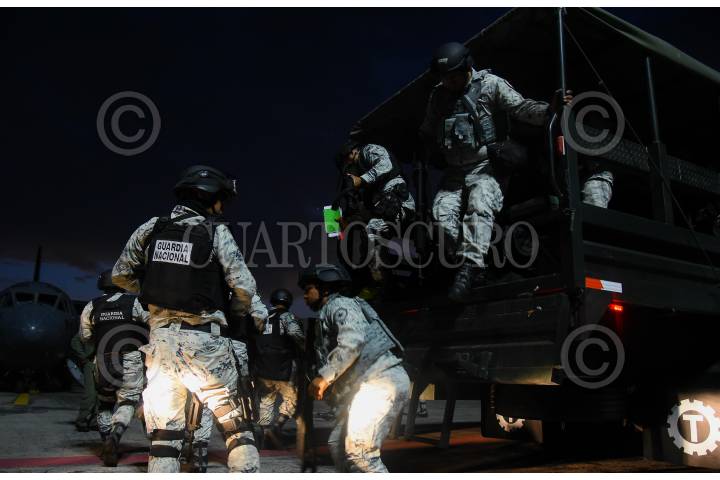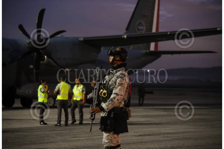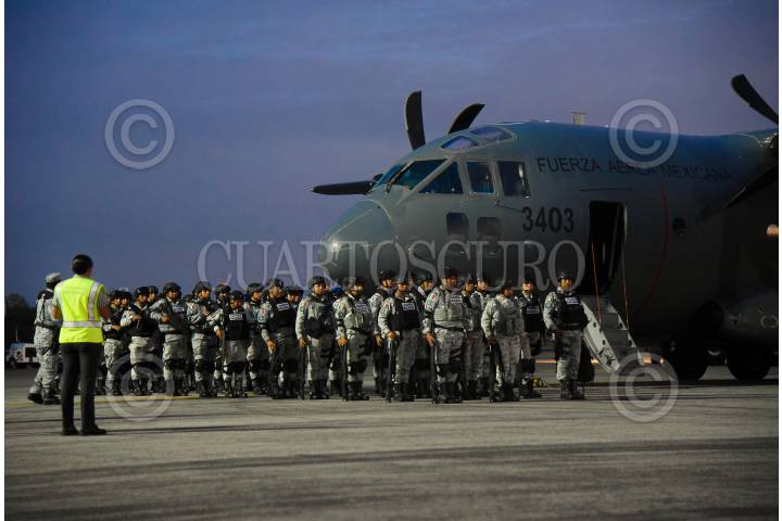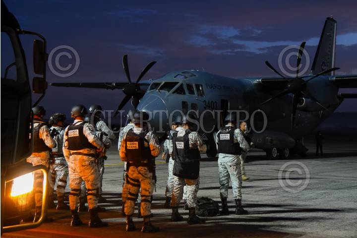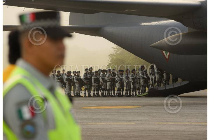 CAMPECHE, CAMPECHE, 04FEBRERO2025.- Alrededor de 500 elementos de la Guardia Nacional fueron trasladados en la madrugada desde el Aeropuerto Internacional Alberto Acuña Ongay de Campeche hacia la frontera norte del país en dos aeronaves militares: un C-130K Hércules y un C-27J Spartan. El despliegue tiene como objetivo reforzar las acciones de rescate humanitario de migrantes y el combate al tráfico de fentanilo. Lo anterior, en cumplimiento de los acuerdos recientes entre la presidenta de México, Claudia Sheinbaum, y el presidente de Estados Unidos Donald Trump. FOTO: MICHAEL BALAM/CUARTOSCURO.COM