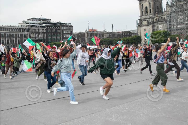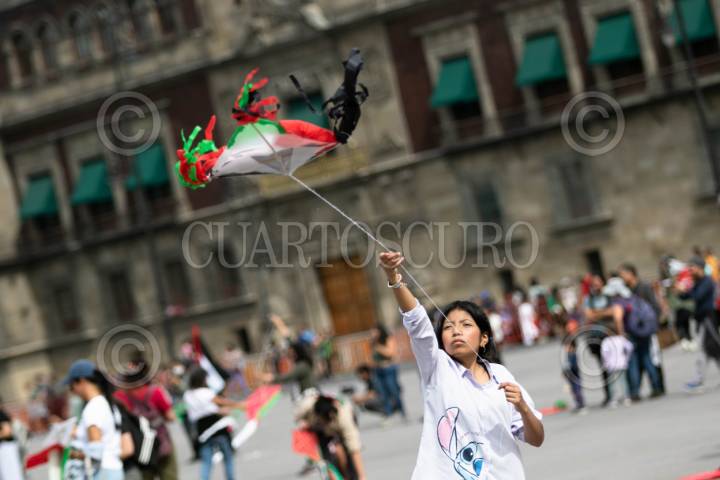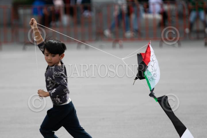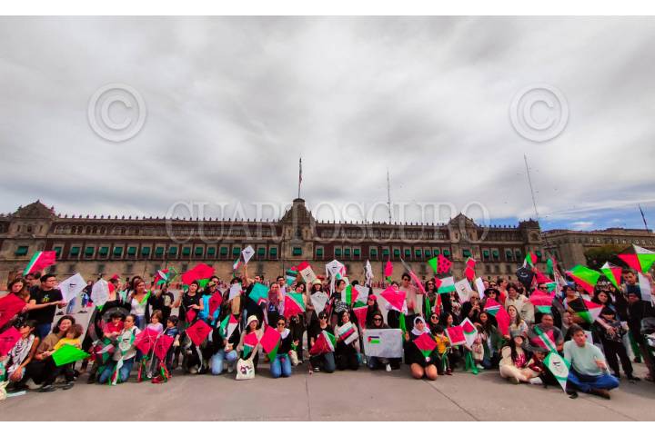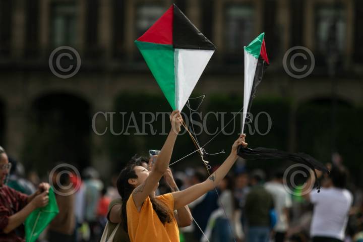 CIUDAD DE MÉXICO, 14ENERO2023.- Personas se unieron al "Vuelo Mundial de Papalotes", en solidaridad con Gaza en la explanada del Zócalo, con el objetivo de exigir un cese al fuego en medio oriente, en lo que ellos califican como un genocidio en contra del pueblo palestino por parte de Israel. FOTO: MOISÉS PABLO/CUARTOSCURO.COM