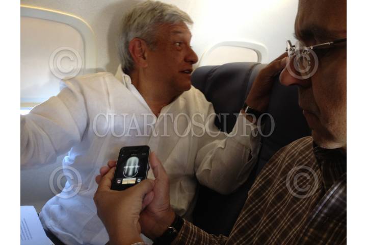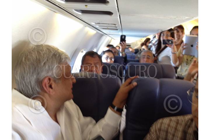 MÉXICO, D.F., 22MAYO2012.- Andrés Manuel López Obrador, candidato a la presidencia de la república por el "Movimiento Progresista", improviso un mitin a 36000 pies de altura. Después de que algunos pasajeros se lo solicitaran, desde el asiento 6C del vuelo 2596 de Aeromexico, Ciudad de México-Reynosa Tamaulipas, Lopez Obrador explicó sus propuestas y como piensa cambiar al país. FOTO: ELEAZAR TORRES/CUARTOSCURO.COM