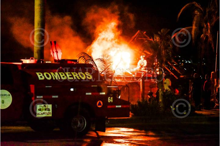 ACAPULCO, GUERRERO. 17JULIO2024.- UDurante la madrugada los restaurantes Crepas Dubai , Mi Vereda Tropical y Marea Salada, ubicados en la franja de arena de la playa Papagayo, sufrieron un incendio que consumió en su totalidad los restaurantes, hasta el momento las autoridades no han informado las causas del incendio, sin embargo este hecho se une a otros casos de negocios que se incendian en las playas del puerto. FOTO: CARLOS CARBAJAL/CUARTOSCURO.COM