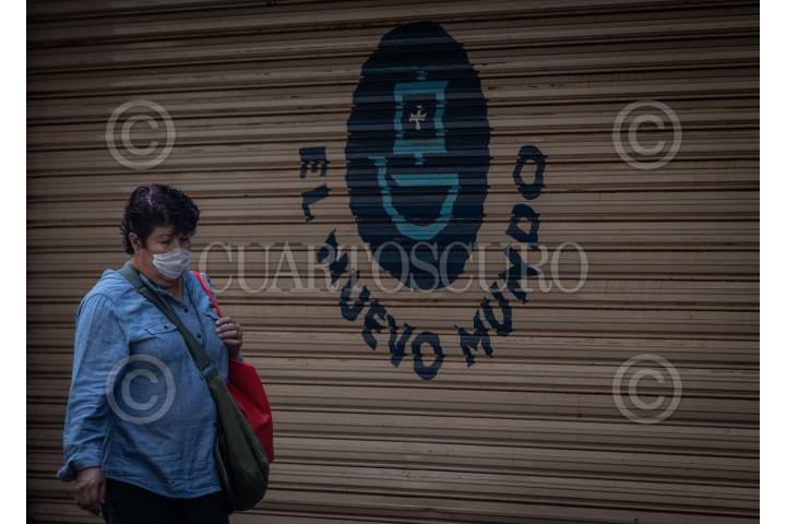 Mujer de tercera edad camina, usando cubrebocas, por las calles del Centro Histórico, donde en su mayoría los locales comerciales se encuentran cerrados