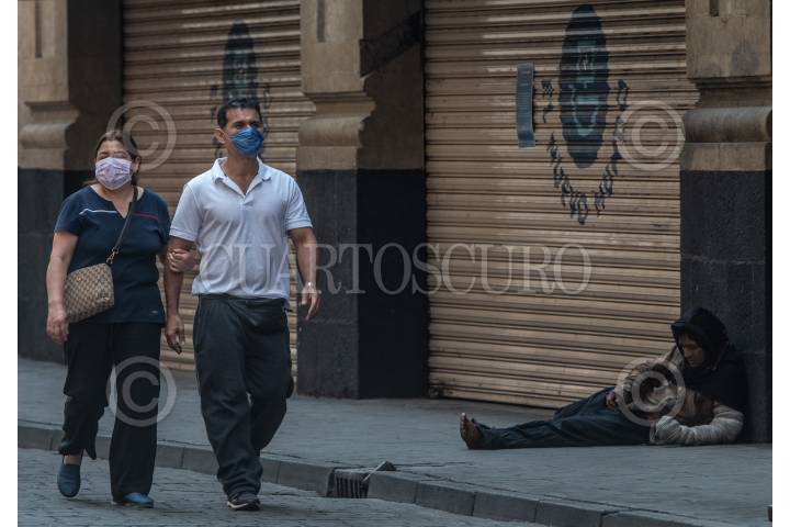 Pareja camina por las calles del Centro Histórico, usando cubrebocas, donde en su mayoría los locales comerciales se encuentran cerrados