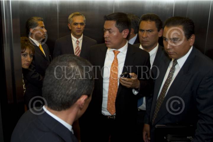 MÉXICO, D.F. 09MAYO2012.- Miguel Ángel Macera, candidato de las izquierdas a la Jefatura de Gobierno del Distrito Federal, acudió al foro "Desarrollo Social y Atención a Grupos Vulnerables" que se realizó en un lujoso hotel de la colonia Centro. El candidato, al termino del foro es acompañado por su grupo de colaboradores y de seguridad. FOTO: GUILLERMO PEREA /CUARTOSCURO.COM
