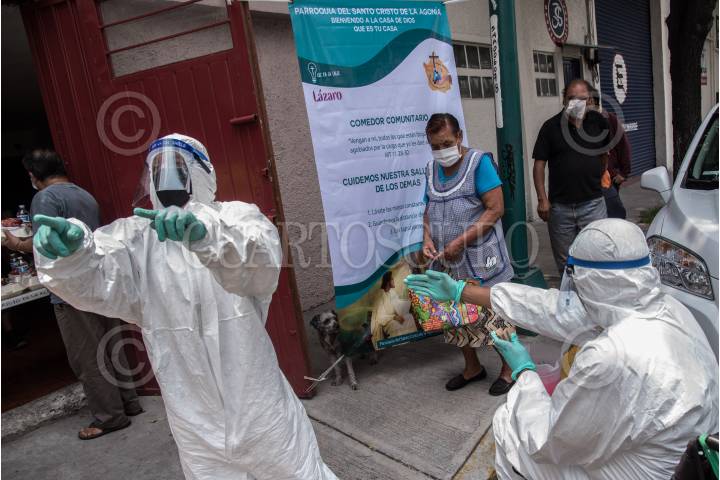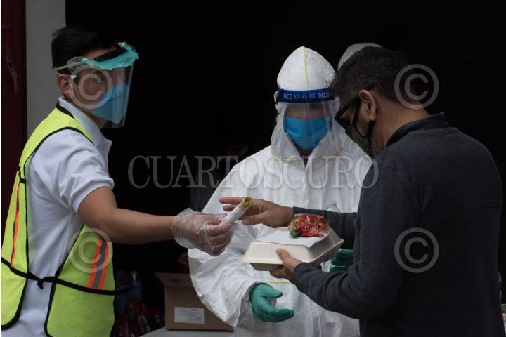 Voluntarios de la Parroquia del Santo Cristo de la Agonía inauguraron el comedor comunitario para brindar ayuda a las personas vulnerables durante la fase 3 de la pandemia por coronavirus (covid-19). El comedor se encuentra en la calle Sándalo 111, con atención de sábado a domingo.