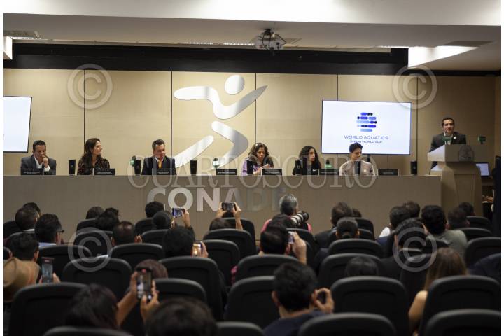 CIUDAD DE MÉXICO, 11MARZO2025.- Luis Fernando Ortega Ramons. Director Code Jalisco; Andrea Blanco Calderon, coordinadora general estrategia y desarrollo social; Pablo Lemus Navarro, Gobernador de Jalisco; Romel Pacheco Marrufo, director de la comisión nacional cultura física y deporte; María José Alcalá Izguerra, presidenta del Comité olímpico Mexicano; Gabriela Guillen Agundez Garcia, Medallista Olimpica y Osmar Olvera, medallista Olímpico ofrecieron conferencia de prensa para hablar sobre el evento de natación World Aquatics diving world cup que se llevará a cabo del 3 a 9 de abril en la Ciudad de Guadalajara. FOTO: ANDREA MURCIA /CUARTOSCURO.COM