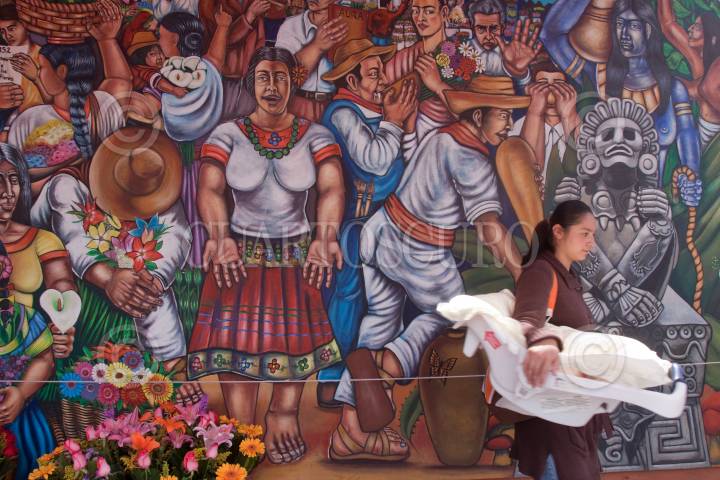 MÉXICO, D.F., 09SEPTIEMBRE2010.- Mural en homenaje a Xochipilli, quien era el dios mexica del amor, los juegos, la belleza, la danza, las flores, el maíz, el placer, las artes y las canciones. Esto, en el mercado de flores de San Ángel. FOTO: IVÁN STEPHENS/CUARTOSCURO.COM