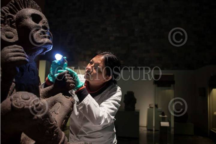 CIUDAD DE MÉXICO,12JULIO2018.- Dentro de la exposición en el MNA del INAH "Xochipilli, el señor de la flores" se exhibe el monolito de dicho Dios, escultura que es símbolo de la calidad técnia y excelencia artística de nuestros antepasados mexicas, que data del peridodo Posclásico Tardío (1200-1521a.C.), el cual ha sido examinado mediante diversas pruebas para identicficar sus colores base, que hasta ahora coinciden con tonalidades rojas en si mayoría, ocre en el delineado de las decoraciones y blanco como base de preparación. FOTO: MAURICIO MARAT /SECRETARÍA DE CULTURA /CUARTOSCURO.COM