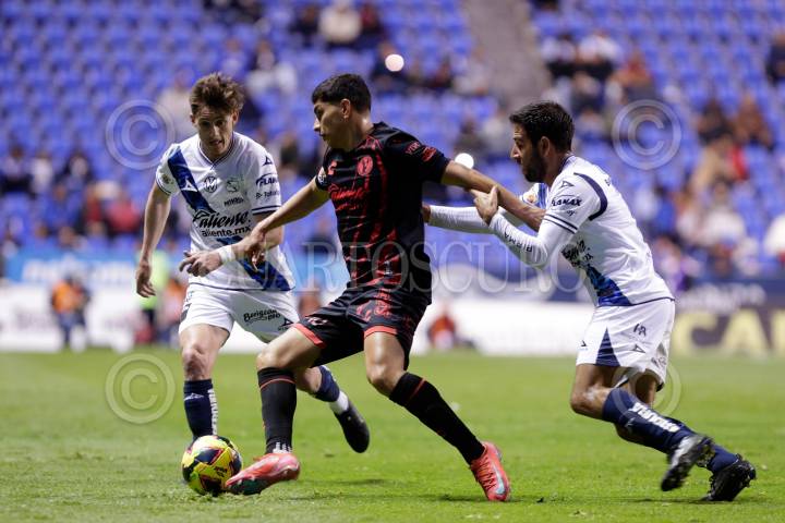 PUEBLA, PUEBLA, 21FEBRERO2025.- Facundo Waller durante, Kevin Castañeda y Pablo Gonzalez, durante el partido entre el Club Puebla y los Xolos de Tijuana, correspondiente a la jornada 8 del torneo Clausura 2025 de la Liga BBVA MX, celebrado en el Estadio Cuauhtémoc. FOTO: MIREYA NOVO/ CUARTOSCURO.COM
