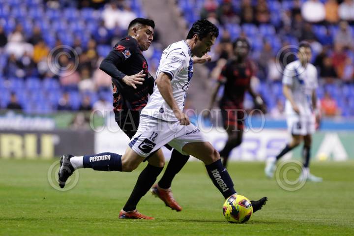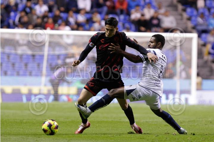 PUEBLA, PUEBLA, 21FEBRERO2025.- Joe Corona y Raúl Castillo durante el partido entre el Club Puebla y los Xolos de Tijuana, correspondiente a la jornada 8 del torneo Clausura 2025 de la Liga BBVA MX, celebrado en el Estadio Cuauhtémoc. FOTO: MIREYA NOVO/ CUARTOSCURO.COM