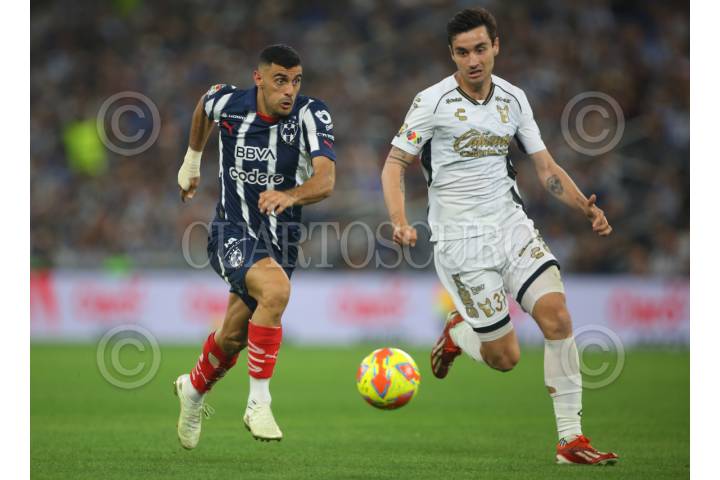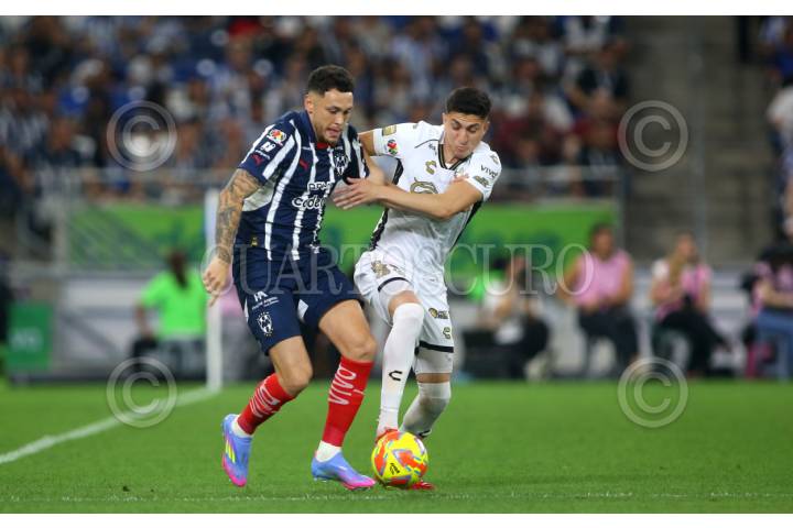 GUADALUPE, NUEVO LEÓN, 29MARZO2025.- Gerardo Artega de los Rayados del Monterrey, se disputa el balón con Jesús Gómez de los Xolos de Tijuana, en el estadio BBVA, partido correspondiente a la jornada 13 de la Clausura 2025 de la Liga Mx. Marcador Final: Monterrey: 1 - Xolos: 2. FOTO: GABRIELA PÉREZ MONTIEL / CUARTOSCURO.COM