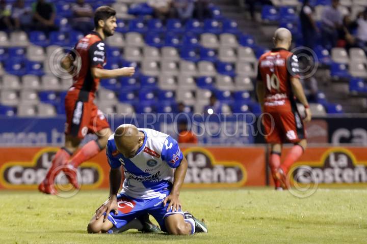 PUEBLA, PUEBLA, 11AGOSTO2017.- El jugador del Club Puebla; Francisco Acuña, lamenta el resultado obtenido ante los Xolos de Tijuana con marcador final 1-1 correspondiente a la jornada 4 del torneo de Apertura de la Liga MX. FOTO: HILDA RÍOS /CUARTOSCURO.COM