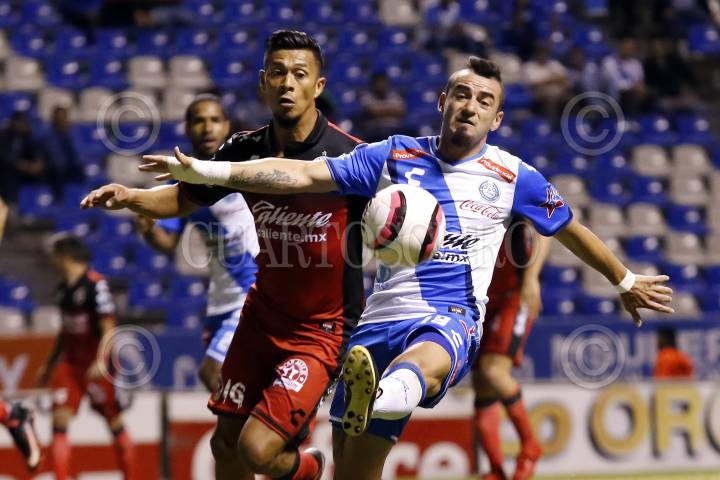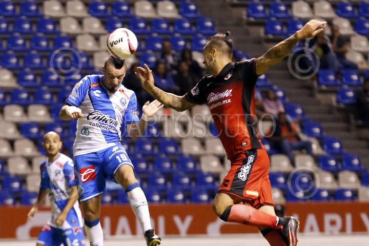 PUEBLA, PUEBLA, 11AGOSTO2017.- Los jugadores Carlos Salom y Víctor Aguilera durante jugada del partido entre el Club Puebla y los Xolos de Tijuana con marcador final 1-1 correspondiente a la jornada 4 del torneo de Apertura de la Liga MX. FOTO: HILDA RÍOS /CUARTOSCURO.COM
