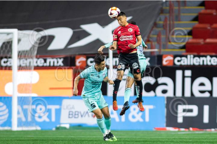 CIUDAD DE MÉXICO, 14ABRIL2019.- El defensa de Xolos de Tijuana, Julián Velázquez, despeja una balón de su área, durante el partido en contra de los Pumas de la UNAM, a la postre los felinos ganaron 1-0, en partido disputado en el Estado Olímpico. FOTO: MOISÉS PABLO /CUARTOSCURO.COM
