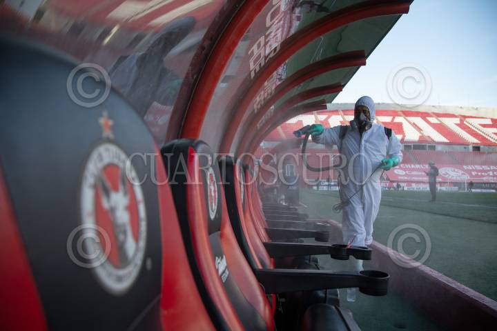 Personal del estadio Caliente sanitiza las bancas donde se sientan los jugadores durante el partido.