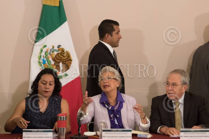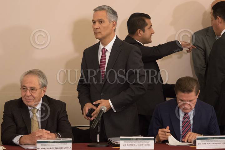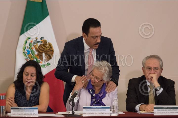 CIUDAD DE MÉXICO, 30ABRIL2019.- Jorge Alcocer Varela, secretario de Salud; Ricardo Bucio Mújica, secretario ejecutivo del SIPINNA, y Olga Sánchez Cordero, secretaria de Gobernación, y José Rosas Aispuro, gobernador de Durango, durante la ceremonia de instalación del Sistema de Protección Integral de los Derechos de las Niñas, Niños, y Adolescentes, realizado en las instalaciones de la Segob. FOTO: MOISÉS PABLO /CUARTOSCURO.COM