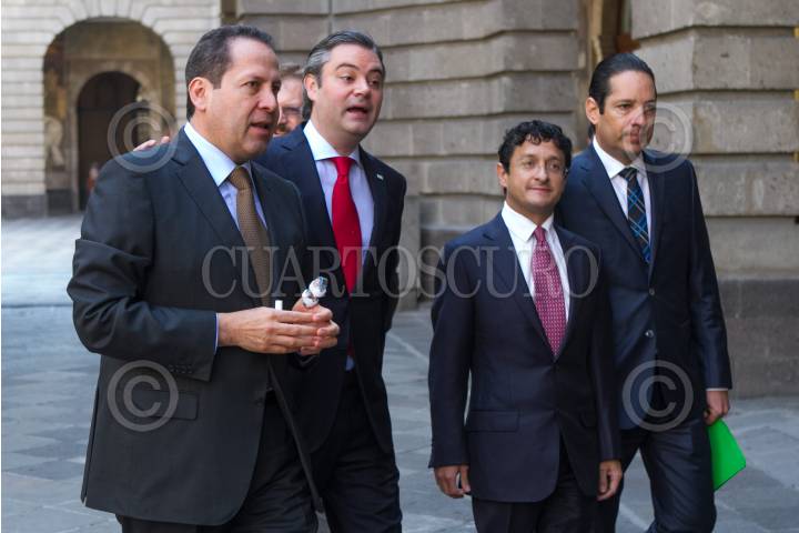 CIUDAD DE MÉXICO, 23FEBRERO2016.- Eruviel Ávila, gobernador del Estado de México; Aurelio Nuño, secretario de Educación Pública; Virgilio Andrade, secretario de la Función Pública, y Francisco Domínguez Servien, gobernador de Querétaro, durante caminan en los pasillo de la SEP en donde se presentó el el portal de transparencia del programa "Escuelas al CIEN". FOTO: MOISÉS PABLO /CUARTOSCURO.COM