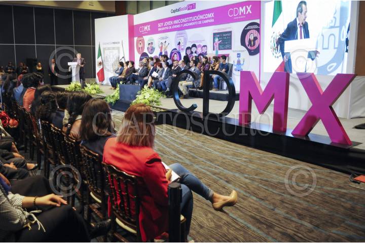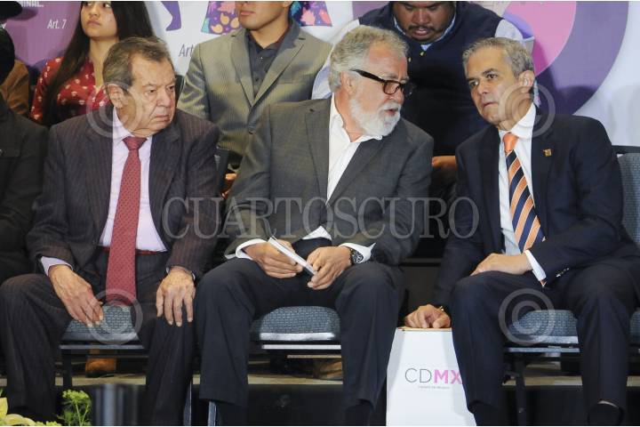 CIUDAD DE MÉXICO, 05JULIO2017.- Los legisladores constituyentes Porfirio Muñóz Ledo y Alejandro Encinas, y Miguel Ángel Mancera, jefe de gobierno capitalino, durante el lanzamiento de la campaña Soy Joven #MiConstituciónCDMX. FOTO: DIEGO SIMÓN SÁNCHEZ /CUARTOSCURO.COM