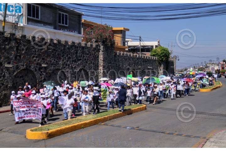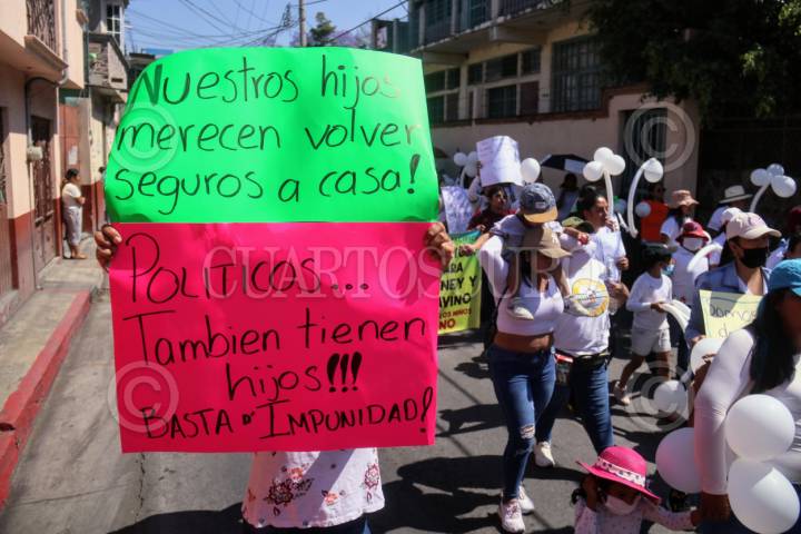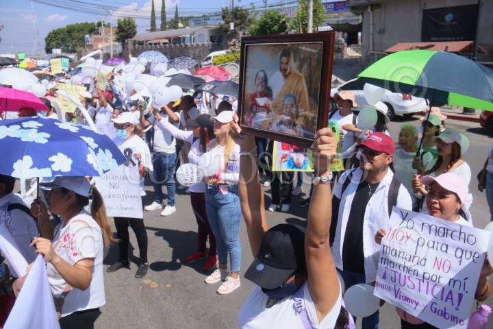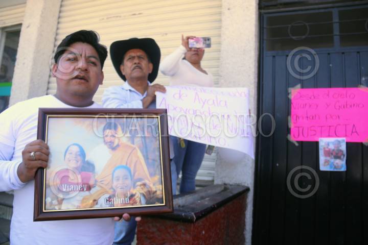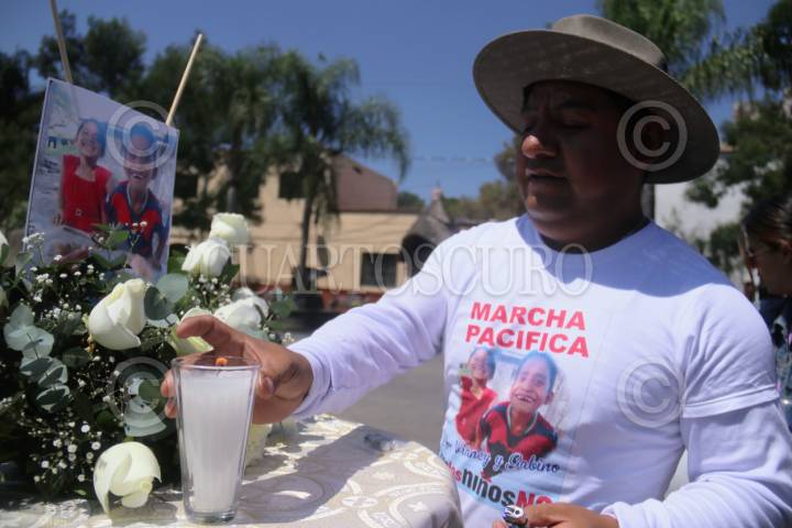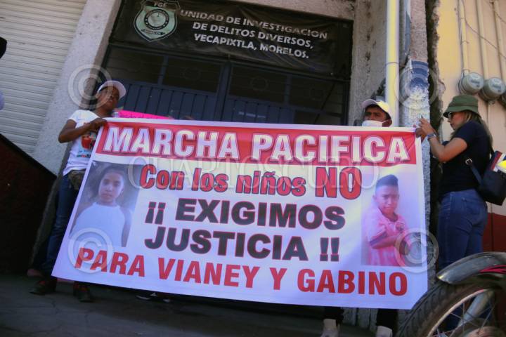 YECAPIXTLA, MORELOS, 12MARZO2024.- María Luisa y Juan, padres de los niños Gabino y Vianey, protestan frente a la Unidad de Investigación de Delitos Diversos de la Fiscalía de Justicia de Morelos. Los menores de edad fueron asesinados cuando se dirigían a la escuela comunitaria del Consejo Nacional de Fomento Educativo en la colonia precarista Paraíso el pasado viernes. Hoy decenas de vecinos, acompañaron a los familiares en una marcha que recorrió todo el centro del municipio con la exigencia de justicia en este caso. FOTO: MARGARITO PÉREZ RETANA/CUARTOSCURO.COM
