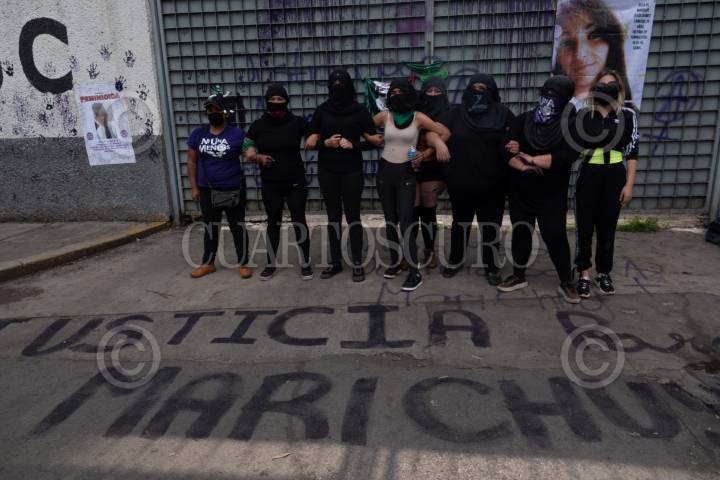 Mujeres de colectivas feministas realizaron pintas e las inmediaciones de la Fiscalía Especializada durante la reunión de Yesenia Zamudio madre de supuesta víctima de feminicidio con Sayuri Herrera, fiscal especial de víctimas de feminicidio
