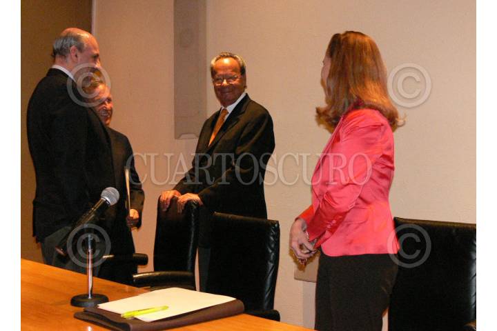 MÉXICO, D.F. 05JULIO2007.- Enrique Cabrero, Enrique Cárdenas, Jesús Silva Herzog y Amparo Espinosa previo a la conferencia de prensa donde anunciaron la convocatoria al premio Manuel Espinoza Yglesias" para analizar la nacionalización bancaria del 82. FOTO: PATRICIA MORALES/CUARTOSCURO.COM