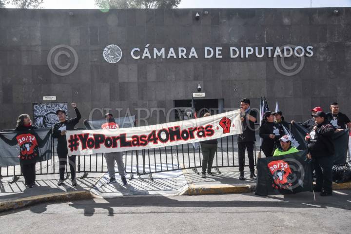 CIUDAD DE MÉXICO, 12DICIEMBRE2023.- Integrantes del colectivo "Yo por las 40 horas" que manifestaron al exterior del recinto legislativo de San Lázaro, en apoyo a la iniciativa de reforma que busca reducir la jornada laboral de 48 a 40 horas semanales con dos días de descanso obligatorio por cada cinco trabajados. FOTO: MARIO JASSO/CUARTOSCURO.COM