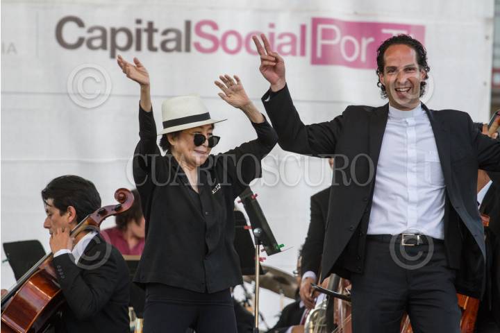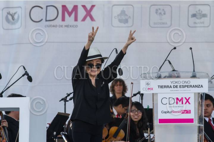 CIUDAD DE MÉXICO, 02FEBRERO2016.- La artista Yoko Ono inauguró la pieza "El árbol de los deseos" en el Zócalo capitalino, la cual forma parte de la exposición "Tierra de Esperanza". Durante la ceremonia, la viuda del músico John Lennon recibió un boleto conmemorativo del STC Metro y bailó con la orquesta Sinfónica Juvenil Ollin Yoliztli. FOTO: ISAAC ESQUIVEL /CUARTOSCURO.COM